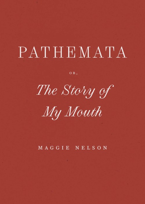 Before I started writing this review, I dreamt I was writing it. In the sweaty haze of a migraine – whereupon every emergence into consciousness I tried to drop back into unconsciousness to not feel the drilling pain in my skull – my unconscious pieced together fragments of my waking life. These pieces came together in a likely incoherent argument that Maggie Nelson’s Pathemata, Or, the Story of My Mouth was both simultaneously authentic to, and performative of, femininity. Unreality was, fleetingly, reality. Then, I woke.